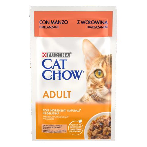 PURINA CAT CHOW Adulto con Buey en tiernos trozos en gelatina con berenjena 85g. Alimento completo para gatos adultos. Tu gato es increíble. Para ayudarle a mantenerse así, PURINA CAT CHOW está formulado con proteína de calidad e ingredientes naturales. Basado en nuestra experiencia en nutrición felina desde 1926, Purina CAT CHOW es una nutrición completa, equilibrada, con todo lo que tu gato necesita para tener una vida increíble y saludable.