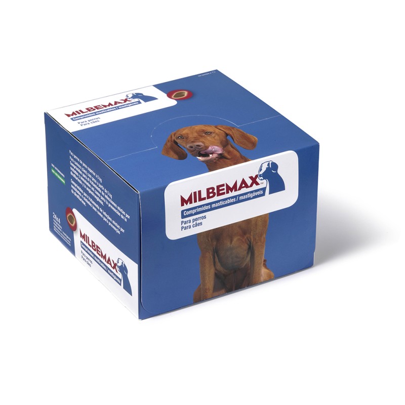 Milbemax® Comprimidos Masticables para Perros: Caja con 2 comprimidos en blíster y caja con 48 comprimidos en blíster.