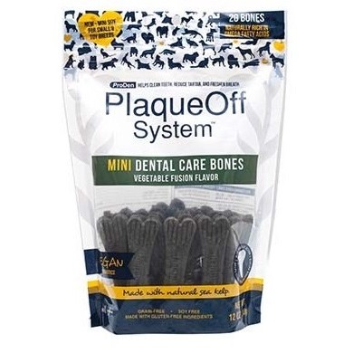 ProDen PlaqueOff Mini Dental Care Bones son huesos para masticar desarrollados para razas de perros pequeños. Al igual que nuestros Dental Care Bones normales, los Mini son los únicos masticables del mercado que contienen el ingrediente de algas A.N ProDen®, 100 % natural y clínicamente probado. Los Mini Bones ayudan a superar los problemas bucodentales con una doble acción: A.N ProDen® actúa a través del organismo del animal, donde disuelve el sarro existente y previene la formación de nueva placa. Su exclusiva forma y la acción abrasiva del hueso ayudan a eliminar la placa y el sarro, lo que contribuye a refrescar el aliento. También contiene ácidos grasos omega 3 y 6 y antioxidantes que favorecen la salud inmunitaria. El sabor vegetal fusión contiene una receta vegana y probióticos, y es la recompensa perfecta para que el perro disfrute.