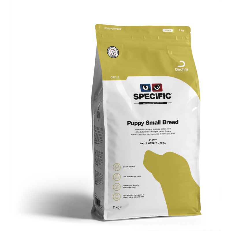 SPECIFIC® CPD-S Puppy Small Breed es una dieta muy adecuada para cachorros de razas pequeñas, desde el destete (5-6 semanas) hasta que alcancen el 80% de su peso adulto. A partir de entonces, se puede ir cambiando gradualmente a SPECIFIC® CXD-S Adult