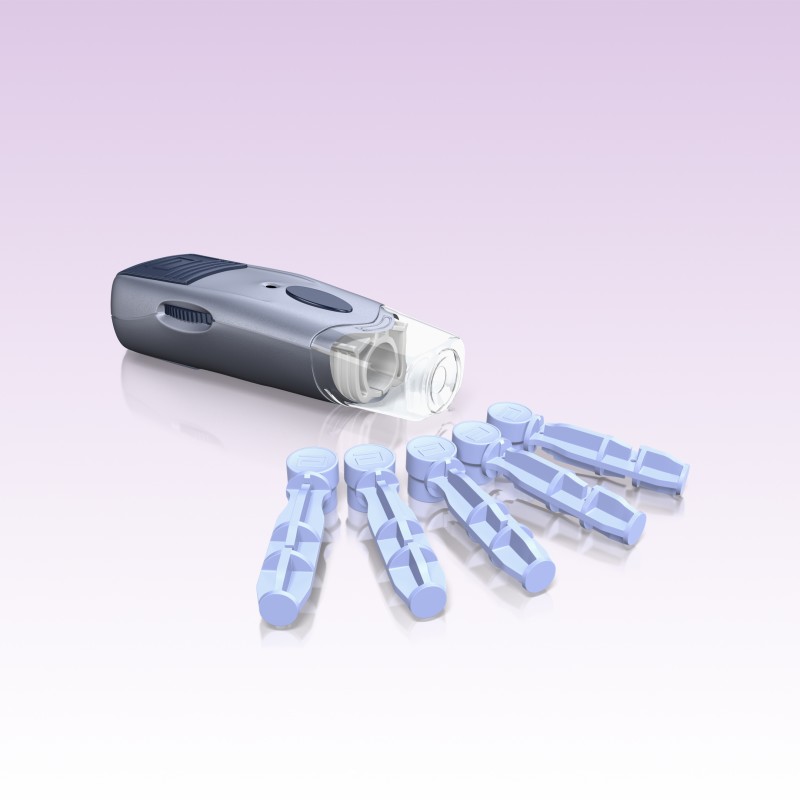 - Starter kit (glucómetro, dispositivo de punción, 30 lancetas, 25 tiras reactivas y 4 ml de solución control).