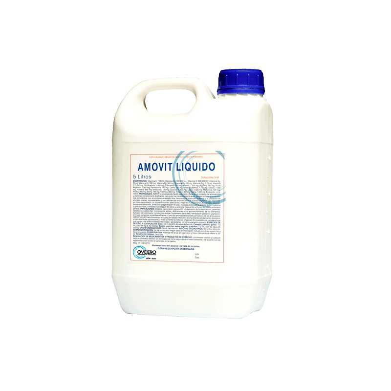 Aves, conejos, perros, gatos, bovino, porcino, ovino, caprino y equino. Estados carenciales: prevención y tratamiento de la desnutrición, anemias, estados convalecientes y anoréxicos, estrés, deficiencia en aprovechamiento de los alimentos. Activador del crecimiento y la producción animal. Suplemento de la dieta: hembras en gestación y lactación, animales sometidos a grandes esfuerzos. Como los aminoácidos constituyen la base de los anticuerpos, AMOVIT LÍQUIDO se suministra en cualquier estado infeccioso acompañando el tratamiento etiológico, o bien durante vacunaciones, a fin de aumentar las defensas orgánicas. En los estados de convalecencias que siguen a las enfermedades infecciosas y parasitarias como recuperador orgánico.