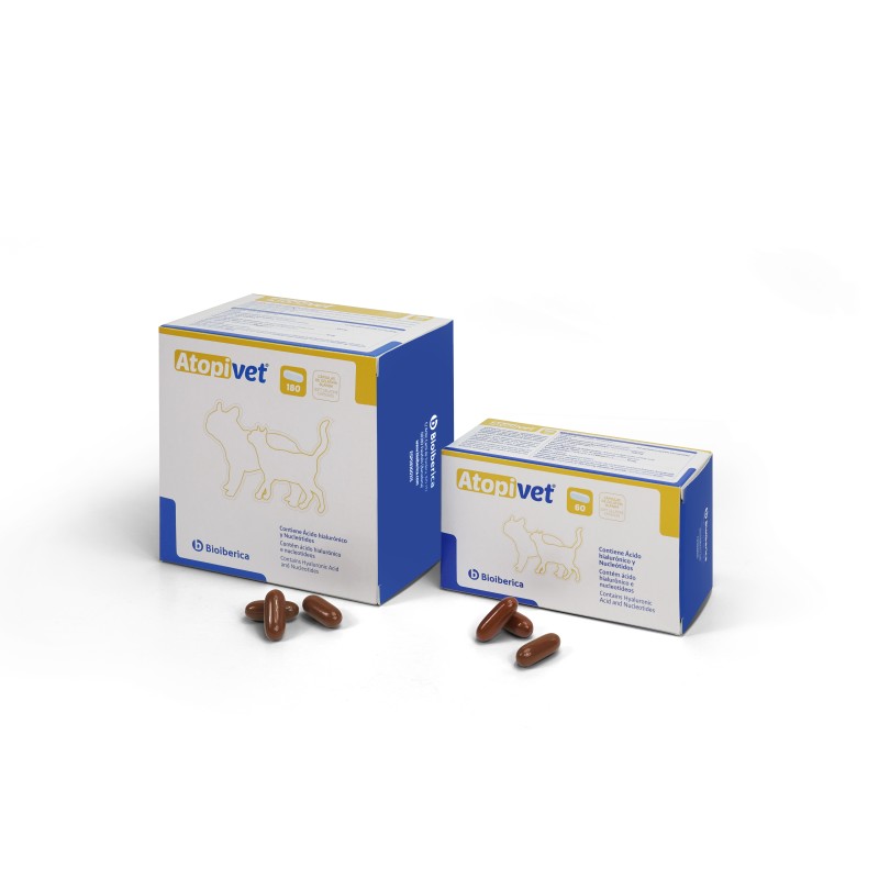 ATOPIVET® Cápsulas es un alimento complementario para perros y gatos que contiene ácido hialurónico y nucleótidos. La piel de perros y gatos contiene nucleótidos y ácido hialurónico de forma natural.