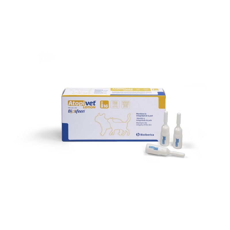 ATOPIVET® Lotion es un producto de higiene para perros y gatos que contribuye a mantener la integridad de la piel sana, hidratando y nutriendo la piel de las mascotas.