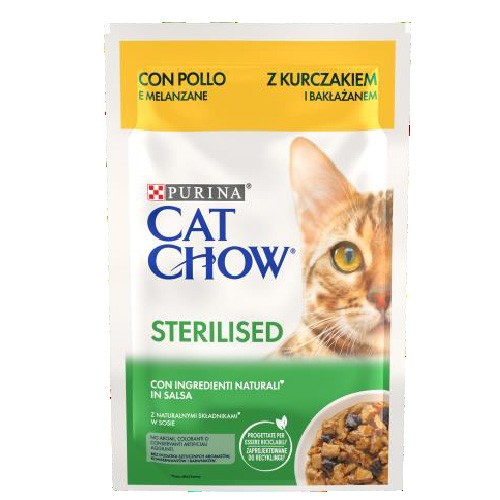 PURINA CAT CHOW Adulto con tiernos trozos de pollo y berenjenas en salsa 85g. Alimento completo para gatos adultos esterilizados. Tu gato es increíble. Para ayudarle a mantenerse así, PURINA CAT CHOW está formulado con proteína de calidad e ingredientes naturales. Basado en nuestra experiencia en nutrición felina desde 1926, Purina CAT CHOW es una nutrición completa, equilibrada, con todo lo que tu gato necesita para tener una vida increíble y saludable.