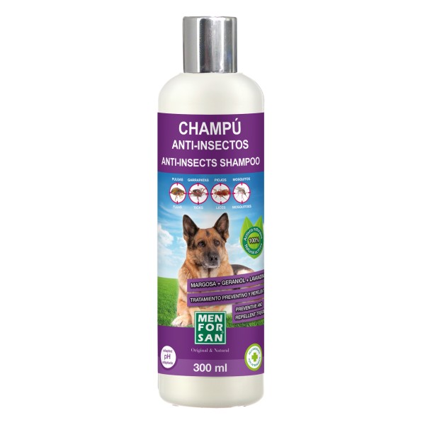 Champú de máxima calidad para perros con activos naturales. La MARGOSA actúa como activo anti-insectos presentes en la piel y en el pelaje (pulgas, garrapatas, chinches y ácaros). El GERANIOL y el LAVANDINO actúan como preventivo y repelente de infestaciones de todo tipo de insectos parásitos y voladores (pulgas, garrapatas, chinches, ácaros y mosquitos) después del lavado. Además, los colágenos presentes en la formulación del producto hidratan y reparan el pelaje dañado y estropeado. Este champú se puede utilizar de manera frecuente y es apto para todas las razas y tipos de pelajes.