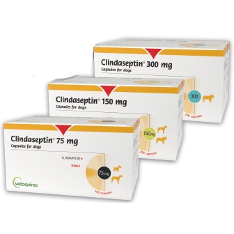 11 mg/kg de clindamicina cada 12 horas durante un periodo mínimo de 4 semanas (es decir, 2 cápsulas por cada 27 kg de peso corporal dos veces al día). Si no se observa mejoría después de 14 días la sensibilidad de los patógenos implicados debe ser reevaluada.