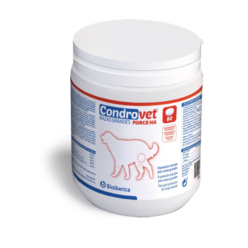 CONDROVET® FORCE HA para razas grandes es un alimento complementario recomendado para el mantenimiento de las articulaciones de perros de razas grandes. El Condroitín sulfato y la Glucosamina HCl son componentes fundamentales de la matriz del cartílago articular y ayudan a mantener la funcionalidad y movilidad de las articulaciones. Mobilee®, gracias a su contenido en Ácido Hialurónico contribuye al correcto mantenimiento del líquido sinovial, esencial para recuperar la movilidad articular.