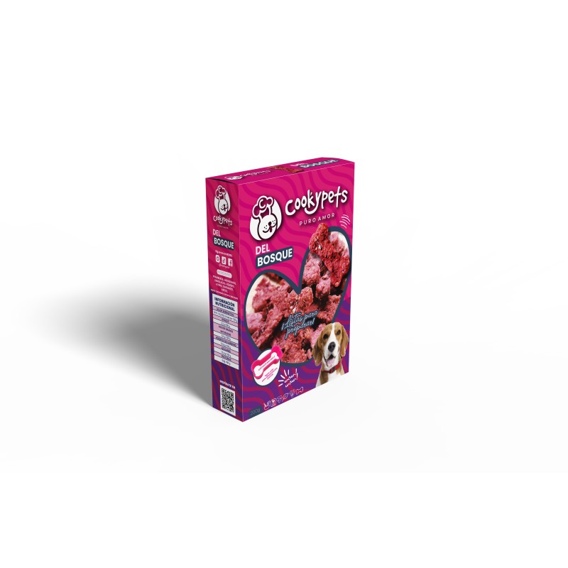 Del Bosque de cookypets es un premio en forma de galleta muy atractiva en sabor, color y forma para tu mascota. Riquísima receta con frambuesa, arándanos, remolacha, romero, avena, garbanzo y arroz. Todo ingredientes naturales, sin saborizantes, ni colorantes, conservantes o estabilizantes artificiales.