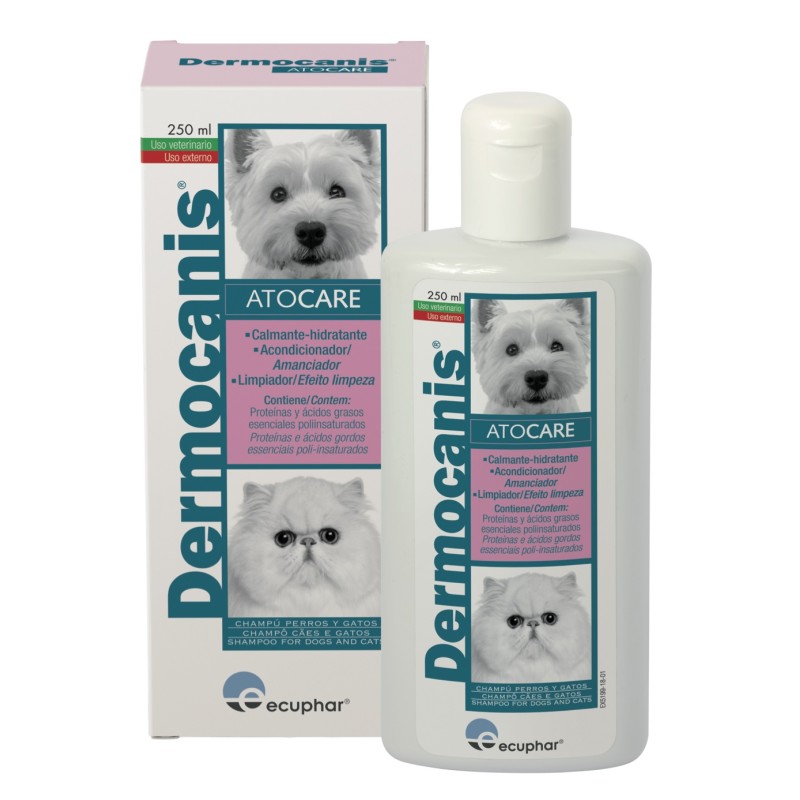 El poder limpiador, hidratante y acondicionador de Dermocanis Atocare, elimina la suciedad y alergenos de la superficie de la piel, regula su flexibilidad y permeabilidad, devolviéndole sus propiedades naturales y reduciendo la intensidad del prurito. La mejoría del estado de la piel aumenta el bienestar del animal y en los casos en que sean necesarios, permite la óptima efectividad de otros tratamientos más radicales.