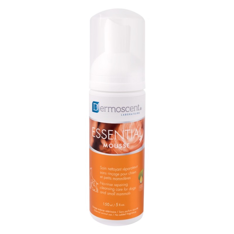 Essential Mousse®, que se presenta en un frasco dosificador sin gas, es el primer producto limpiador reparador que no precisa aclarado y para uso frecuente en perros, gatos y pequeños mamíferos (conejos, hurones, cobayos, hámsters, ratas, ratones…). Está formulado a base de ingredientes 100% naturales, entre los cuales un agente calmante, y no contiene jabón. Essential Mousse™ permite: