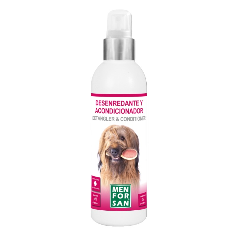 Potente desenredante y acondicionador para perros que proporciona un cepillado sin tirones. Acondiciona y potencia el brillo del pelaje aportando sedosidad y volumen. Deshace todo tipo de enredos y evita roturas del pelaje. Favorece el cepillado y elimina la electricidad estática debido a su efecto acondicionador no graso.