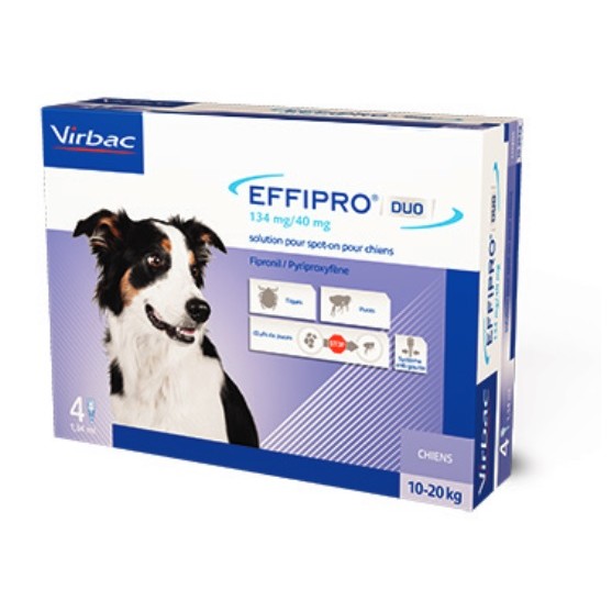 - Perros de 10-20 kg: 1 pipeta de Effipro Duo 134 mg/ 40 mg.