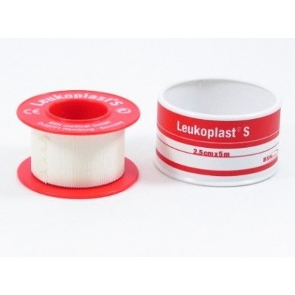 Esparadrapo de tejido poroso de color blanco, de alta adhesividad inicial y permanente a la piel, de gran resistencia a la tracción, y de gran adaptabilidad. Transpirable, repelente al agua y transpirable. Compuesto por una masa adhesiva de oxido de zinc, caucho y resina, recubierta con un tejido de seda artificial (acetato de celulosa). Leukoplast S contiene látex de caucho natural.
