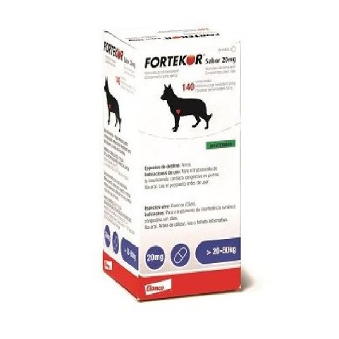 FICHA TÉCNICA O RES UMEN DE LAS CARACTERÍS TICAS DEL PRODUCTO 1. DENOMINACIÓN DEL MEDICAMENTO VETERINARIO FORTEKOR SABOR 20 mg Comprimidos para perros 2. COMPOS ICIÓN CUALITATIVA Y CUANTITATIVA Sustancia activa: Hidrocloruro de benazepril 20 mg Para la lista completa de excipientes, véase la sección 6.1. 3. FORMA FARMACÉUTICA Comprimidos. Color beige a marrón claro, ovoide, divisible, ranurado por ambas caras. 4. DATOS CLÍNICOS 4.1 Es pecies de destino Perros 4.2 Indicaciones de uso, es pecificando las especies de destino Perros: Tratamiento de la insuficiencia cardiaca congestiva. 4.3 Contraindicaciones No usar en caso de hipersensibilidad a la sustancia activa o a algún excipiente. No usar en casos de hipotensión, hipovolemia, hiponatremia o fallo renal agudo. No usar en casos de caída del gasto cardíaco debido a estenosis aórtica o pulmonar. No usar durante la gestación ni la lactancia (sección 4.7). 4.4 Advertencias especiales para cada es pecie de destino Ninguna. 4.5 Precauciones especiales de uso Precauciones especiales para su uso en animales Durante los ensayos clínicos en perros no se han observado evidencias de toxicidad renal del medicamento, sin embargo, como rutina en los casos de enfermedad renal crónica, durante el tratamiento se recomienda monitorizar la creatinina plas mática, la urea y el recuento de eritroc itos. Precauciones específicas que debe tomar la persona que administre el medicamento a los animales Lavarse las manos antes de usar. En caso de ingestión accidental, consulte con un médico inmediatamente y muéstrele la etiqueta o el prospecto. Las mujeres embarazadas deberán tomar especial precaución para evitar una exposición oral acc idental ya que se ha visto que en humanos los inhibidores de la ECA afectan al feto durante el embarazo. 4.6 Reacciones adversas (frecuencia y gravedad) En ensayos clínicos doble ciego en perros con insuficiencia cardiaca congestiva, FORTEKOR SABOR 20 mg fue bien tolerado, con una incidencia de reacciones adversas más baja que la observada en los perros tratados con placebo. Un pequeño número de perros puede presentar vómitos, falta de coordinación o signos de fatiga transitorios. En perros con enfermedad renal crónica, FORTEKOR SABOR 20 mg podría aumentar las concentraciones de creatinina plas mática al inicio del tratamiento. Un incremento moderado de las concentraciones de creatinina plasmática tras la administración de inhibidores de la ECA es compatible con la reducción de la hipertensión glomerular inducida por estos agentes, y por tanto no necesariamente una razón para interrumpir el tratamiento en ausencia de otros signos. 4.7 Uso durante la gestación, la lactancia o la puesta No utilizar durante la gestación ni la lactancia. La seguridad de FORTEKOR SABOR 20 mg no se ha establecido en perros de cría, gestantes o lactantes. Se observaron efectos embriotóxicos (malformación del tracto urinario fetal) en ensayos con animales de laboratorio (ratas) a dosis no tóxicas para la madre. 4.8 Interacción con otros medicamentos y otras formas de interacción En perros con insuficiencia cardiaca congestiva, FORTEKOR SABOR 20 mg se ha administrado en combinación con medicamentos veterinarios digoxina, diuréticos, pimobendan y antiarrítmicos sin interacciones adversas demostrables. En humanos, la combinación de fármacos inhibidores de la ECA y antiinflamatorios no estero ideos (AINE) puede conducir a una reducción de la eficacia antihipertensiva o a una insuficiencia renal. La combinación de FORTEKOR SABOR 20 mg con otros agentes antihipertensivos (p.ej. bloqueantes de los canales del calcio, ß-bloqueantes o diuréticos), anestésicos o sedantes puede conducir a un aumento del efecto hipotensor. Por lo tanto, el uso conjunto de AINE u otros medicamentos con efecto hipotensor deberá considerarse con precaución. Deberá monitorizarse estrechamente la función renal y los signos de hipotensión (letargo, debilidad, etc) y tratarse si es necesario. Las interacciones con diuréticos ahorradores de potasio como la espironolactona, triamtereno o amilorida no se pueden excluir. Se recomienda monitorizar los niveles plasmát icos de potasio cuando se utilice FORTEKOR SABOR 20 mg en combinación con un diurético ahorrador del potasio debido al riesgo de hipercalemia. 4.9 Posología y vía de administración FORTEKOR SABOR 20 mg debe administrarse una vez al día por vía oral, con o sin comida. La duración del tratamiento es ilimitada. Los comprimidos de FORTEKOR SABOR 20 mg están aromatizados y la mayoría de perros los toman voluntariamente. FORTEKOR SABOR 20 mg se debe administrar por vía oral a una dosis mínima de 0,25 mg (intervalo 0,25 – 0,5) de hidrocloruro de benazepril/kg peso una vez al día, de acuerdo con la tabla siguiente: Peso del perro (kg) FORTEKOR SABOR 20 mg Dosis estándar Dosis doble >20 - 40 1/2 comprimido 1 comprimido >40 - 80 1 comprimido 2 comprimidos. La dosis puede doblarse, administrándose una vez al día, a una dosis mínima de 0,5 mg/kg (inte rvalo 0,5-1,0), si el veterinario lo juzga clínicamente necesario. 4.10 Sobredosificación (síntomas, medidas de urgencia, antídotos), en caso necesario FORTEKOR SABOR 20 mg redujo el recuento de eritrocitos en perros normales a una dosis de 150 mg/kg una vez al día durante 12 meses, pero este efecto no se observó durante los ens ayos clínicos en perros a la dosis recomendada. Puede producirse hipotensión transitoria y reversible en casos de sobredosificación accidental. El tratamiento consiste en la infusión intravenosa de suero salino isotónico templado. 4.11 Tiempo de espera No procede. 5. PROPIEDADES FARMACOLÓGICAS Grupo farmacoterapéutico: inhibidor de la ECA, puro. Código ATCvet: QC09AA07 5.1 Propiedades farmacodinámicas El hidrocloruro de benazepril es un profármaco hidrolizado in vivo a su metabolito activo, benazeprilato. El benazeprilato es un inhibidor selectivo altamente potente de la enzi