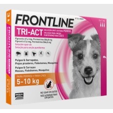 - Frontline Tri-Act Solución Spot-on para Perros 5-10 kg: Fipronilo 67,6 mg; permetrina 504,8 mg; butilhidroxitolueno (E 321) 1,125 mg.