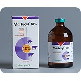 Marbofloxacino es un antiinfeccioso bactericida de sintesis, perteneciente a la familia de las fluoroquinolonas. Actua mediante inhibicion de la ADN girasa. Su espectro de accion es amplio, frente a bacterias Gram ( ) (en particular Staphylococcus), Gram (-) (Escherichia coli, Pasteurella