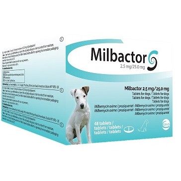 - Milbactor Comprimidos para Perros pequeños y Cachorros: Milbemicina oxima 2,5 mg; praziquantel 25 mg.