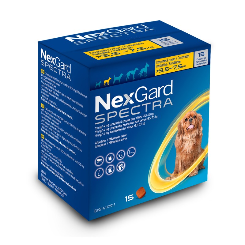 • Perros (>3,5-7,5 kg de peso): 1 comprimido masticable NexGard Spectra 19 mg/4 mg