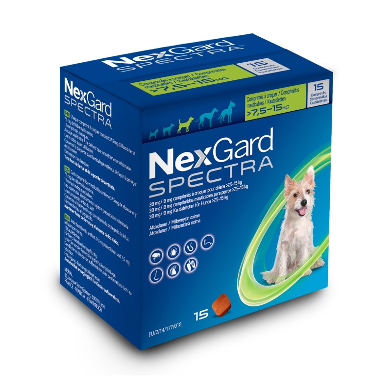 - NexGard Spectra 38 mg/8 mg (perros de más de >7,5 a 15 kg): 37,50 mg de afoxolaner y 7,50 mg de milbemicina oxima.