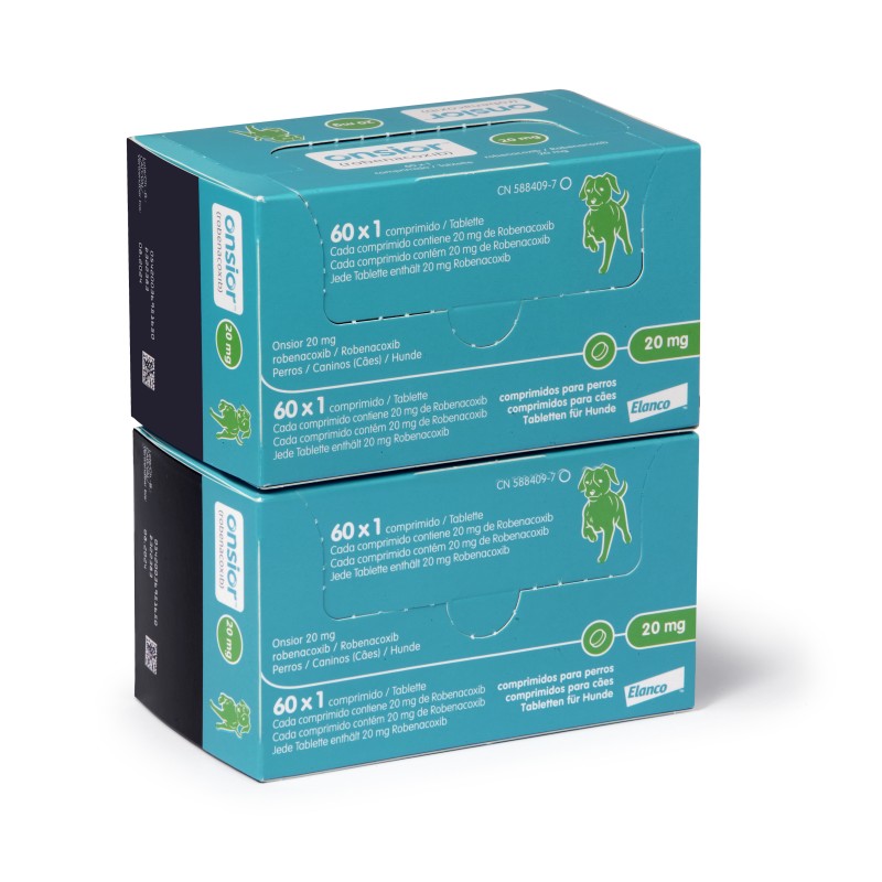 Onsior 10 mg comprimidos para perros; Onsior 20 mg comprimidos para perros; Onsior 40 mg comprimidos para perros. Antiinflamatorio no esteroideo en comprimido oral. Laboratorio NOVARTIS SANIDAD ANIMAL S.L. Forma farmacéutica Comprimido oral (Comp.o.) Composición por comprimido: 10 mg, 20 mg y 40 mg de robenacoxib respectivamente. Indicaciones y especies de destino Para el tratamiento del dolor y la inflamación asociados a osteoartritis crónica en perros. Contraindicaciones No usar en animales con úlcera gastrointestinal. No usar simultáneamente con corticoesteroides ni otros antiinflamatorios no esteroídicos (AINEs). No usar en caso de hipersensibilidad al principio activo o a cualquiera de los excipientes. No usar en animales gestantes ni lactantes porque no se ha establecido la seguridad del robenacoxib durante la gestación y la lactancia, ni en gatos y perros utilizados para reproducción. Vía de administración Por vía oral. Posología No administrar con comida o al menos 30 minutos antes o después de una comida. Los comprimidos de Onsior tienen saborizante y la mayoría de perros los toman voluntariamente. No se deben dividir o partir. La dosis recomendada de robenacoxib es 1 mg/kg de peso con un rango de 1-2 mg/kg. Administrar una vez al día a la misma hora cada día. Normalmente se observa una respuesta clínica al cabo de una semana. El tratamiento debe interrumpirse después de 10 días si no se observa mejora clínica. Para tratamiento a largo plazo, una vez se haya observado la respuesta clínica, la dosis de Onsior puede ajustarse a la dosis efectiva más baja, ya que el grado de dolor e inflamación asociados a osteoartritis crónica puede variar con el tiempo. Deben llevarse a cabo monitorizaciones regulares por el veterinario. Precauciones especiales En los animales: No se ha establecido la seguridad del medicamento veterinario en gatos de menos de 4 meses de edad, en perros de menos de 2 meses, ni en gatos y perros con un peso inferior a 2,5 kg. En perros, en tratamientos prolongados, se deben monitorizar las enzimas hepáticas al principio del tratamiento, p.ej. después de 2, 4 y 8 semanas. Después se recomienda continuar con monitorizaciones periódicas, p.ej. cada 3-6 meses. La terapia se debe detener si la actividad de las enzimas hepáticas aumenta sensiblemente o el perro muestra signos clínicos tales como anorexia, apatía o vómitos en combinación con un aumento de las enzimas hepáticas. El uso en perros o gatos con insuficiencia cardiaca o renal, o en perros o gatos deshidratados, hipovolémicos o hipotensos puede implicar riesgos adicionales. Si no se puede evitar su uso, estos perros/gatos requieren una monitorización cuidadosa. Usar este producto bajo monitorización estricta del veterinario en perros/gatos con riesgo de úlcera gastrointestinal, o si el perro/gato ha presentado previamente alguna intolerancia a otros AINEs. En las personas que administran el medicamento: Lávese las manos después de usar el medicamento veterinario. En caso de ingestión accidental, consulte con un médico inmediatamente y muéstrele el texto del envase o el prospecto. En niños pequeños, la ingestión accidental aumenta el riesgo de efectos adversos por AINEs. En las mujeres embarazadas, sobre todo cerca del final del embarazo, una exposición dérmica prolongada incrementa el riesgo de cierre prematuro del conducto arterioso del feto. Modo de conservación Conservar a temperatura inferior a 25 ºC. Evitar la introducción de contaminación. Período de validez después de abierto el vial: 28 días. Presentación Cajas de 28 comprimidos. Reg. Nº EU/2/08/089/010-014-018