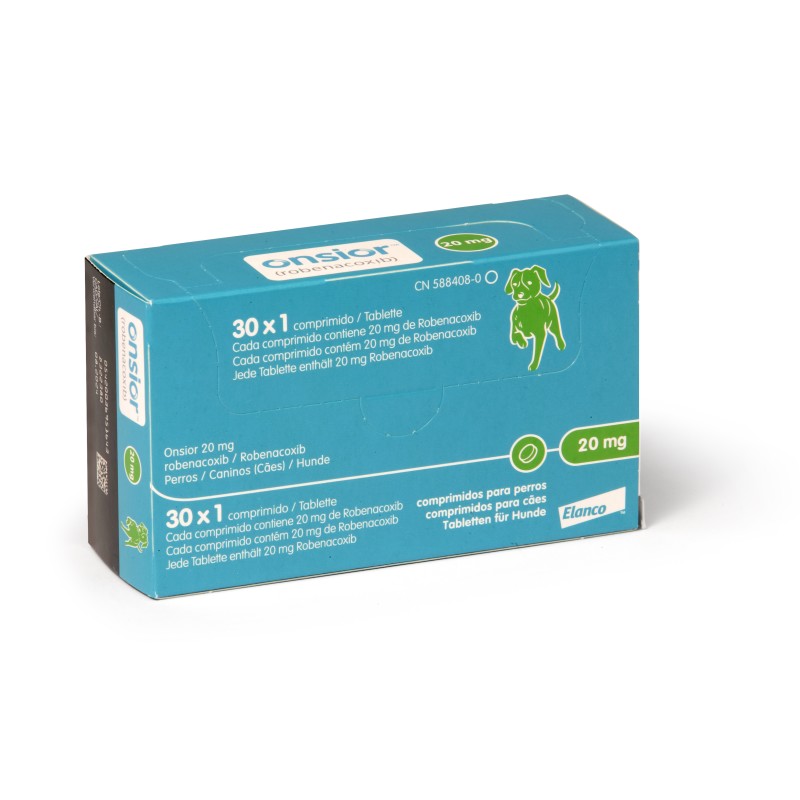 Onsior 10 mg comprimidos para perros; Onsior 20 mg comprimidos para perros; Onsior 40 mg comprimidos para perros. Antiinflamatorio no esteroideo en comprimido oral. Laboratorio NOVARTIS SANIDAD ANIMAL S.L. Forma farmacéutica Comprimido oral (Comp.o.) Composición por comprimido: 10 mg, 20 mg y 40 mg de robenacoxib respectivamente. Indicaciones y especies de destino Para el tratamiento del dolor y la inflamación asociados a osteoartritis crónica en perros. Contraindicaciones No usar en animales con úlcera gastrointestinal. No usar simultáneamente con corticoesteroides ni otros antiinflamatorios no esteroídicos (AINEs). No usar en caso de hipersensibilidad al principio activo o a cualquiera de los excipientes. No usar en animales gestantes ni lactantes porque no se ha establecido la seguridad del robenacoxib durante la gestación y la lactancia, ni en gatos y perros utilizados para reproducción. Vía de administración Por vía oral. Posología No administrar con comida o al menos 30 minutos antes o después de una comida. Los comprimidos de Onsior tienen saborizante y la mayoría de perros los toman voluntariamente. No se deben dividir o partir. La dosis recomendada de robenacoxib es 1 mg/kg de peso con un rango de 1-2 mg/kg. Administrar una vez al día a la misma hora cada día. Normalmente se observa una respuesta clínica al cabo de una semana. El tratamiento debe interrumpirse después de 10 días si no se observa mejora clínica. Para tratamiento a largo plazo, una vez se haya observado la respuesta clínica, la dosis de Onsior puede ajustarse a la dosis efectiva más baja, ya que el grado de dolor e inflamación asociados a osteoartritis crónica puede variar con el tiempo. Deben llevarse a cabo monitorizaciones regulares por el veterinario. Precauciones especiales En los animales: No se ha establecido la seguridad del medicamento veterinario en gatos de menos de 4 meses de edad, en perros de menos de 2 meses, ni en gatos y perros con un peso inferior a 2,5 kg. En perros, en tratamientos prolongados, se deben monitorizar las enzimas hepáticas al principio del tratamiento, p.ej. después de 2, 4 y 8 semanas. Después se recomienda continuar con monitorizaciones periódicas, p.ej. cada 3-6 meses. La terapia se debe detener si la actividad de las enzimas hepáticas aumenta sensiblemente o el perro muestra signos clínicos tales como anorexia, apatía o vómitos en combinación con un aumento de las enzimas hepáticas. El uso en perros o gatos con insuficiencia cardiaca o renal, o en perros o gatos deshidratados, hipovolémicos o hipotensos puede implicar riesgos adicionales. Si no se puede evitar su uso, estos perros/gatos requieren una monitorización cuidadosa. Usar este producto bajo monitorización estricta del veterinario en perros/gatos con riesgo de úlcera gastrointestinal, o si el perro/gato ha presentado previamente alguna intolerancia a otros AINEs. En las personas que administran el medicamento: Lávese las manos después de usar el medicamento veterinario. En caso de ingestión accidental, consulte con un médico inmediatamente y muéstrele el texto del envase o el prospecto. En niños pequeños, la ingestión accidental aumenta el riesgo de efectos adversos por AINEs. En las mujeres embarazadas, sobre todo cerca del final del embarazo, una exposición dérmica prolongada incrementa el riesgo de cierre prematuro del conducto arterioso del feto. Modo de conservación Conservar a temperatura inferior a 25 ºC. Evitar la introducción de contaminación. Período de validez después de abierto el vial: 28 días. Presentación Cajas de 28 comprimidos. Reg. Nº EU/2/08/089/010-014-018