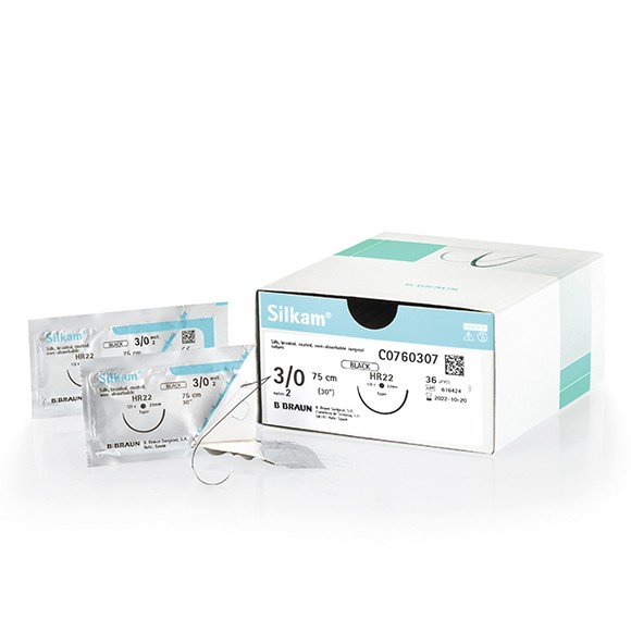 Silkam® es una sutura natural no absorbible polifilar trenzada e impregnada, fabricada a partir de la filástica proteica del capullo del gusano de seda (Bombix morii), de color negro y blanco.