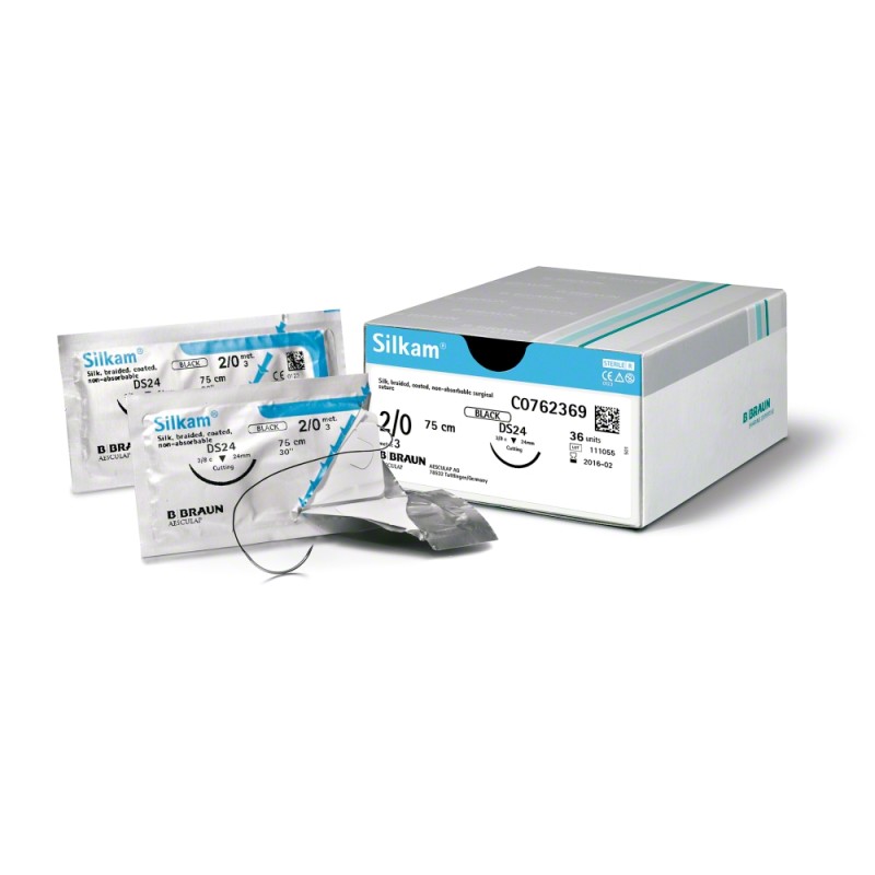 Silkam® es una sutura natural no absorbible polifilar trenzada e impregnada, fabricada a partir de la filástica proteica del capullo del gusano de seda (Bombix morii), de color negro y blanco.