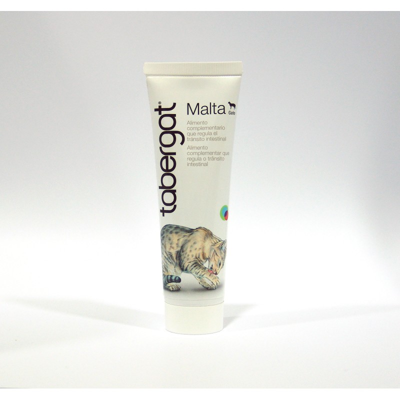 Gatos: Tabergat Malta es un suplemento alimentario, en forma de pasta muy apetitosa a base de productos naturales con cualidades laxantes, con el que se consigue, además de complementar eficazmente la dieta diaria de los animales, regular su tránsito intestinal, contribuyendo a evitar la formación de tricobezoares (bolas de pelo) y casos de estreñimiento.