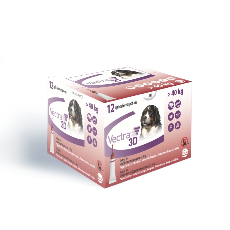 Vectra 3D mata las pulgas en todas sus fases, repele y mata las garrapatas, repele flebótomos, mosquitos y moscas del establo y mata mosquitos y moscas del establo.