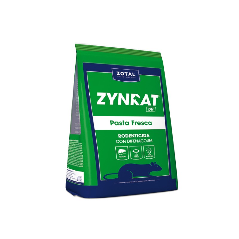ZYNRAT ® DN Pasta Fresca es un cebo en pasta rodenticida listo para su uso. Para el control de infestaciones de rata parda o de alcantarilla y rata común, en todas las etapas del desarrollo. Contiene difenacoum, principio activo anticoagulante de segunda generación. Gracias a su modo de acción, la muerte de los roedores ocurre sin despertar sospechas hacia el cebo por parte de los otros miembros de la colonia.